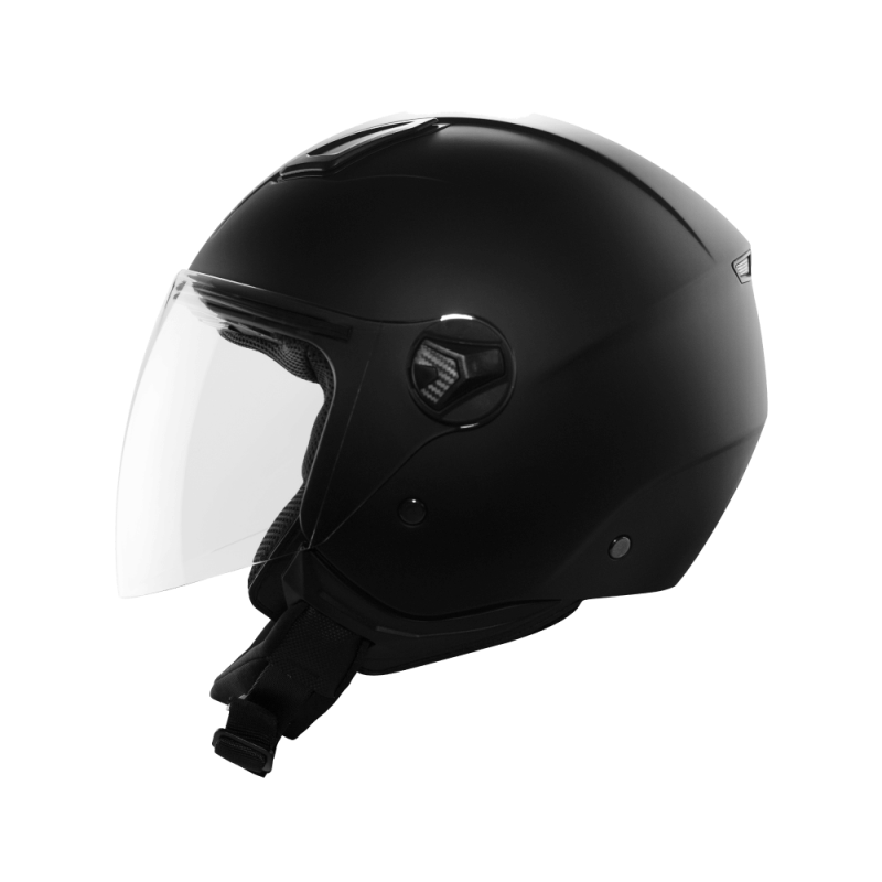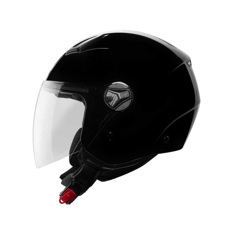 Capacete preto para motociclista com viseira transparente e fecho vermelho
